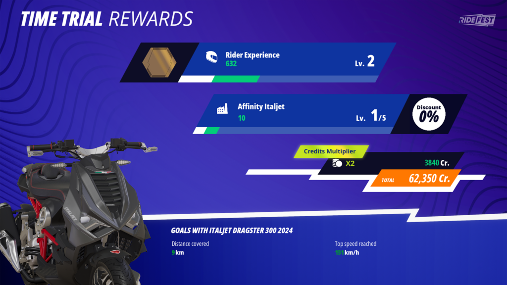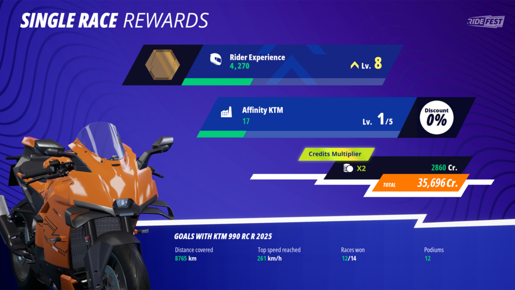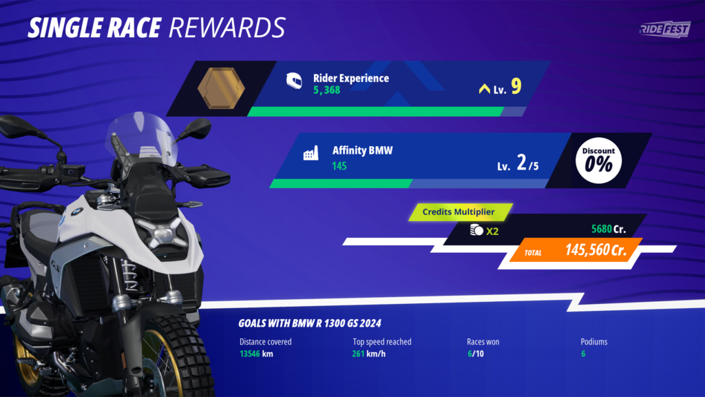 Der RIDE 6 – Credits Multiplier erhöht die Anzahl der Credits, die du am Ende jedes Rennens bekommst: Kauf dir damit mehr Motorräder, Teile und Anpassungen und gestalte dein eigenes Fahrerlebnis schneller als je zuvor.